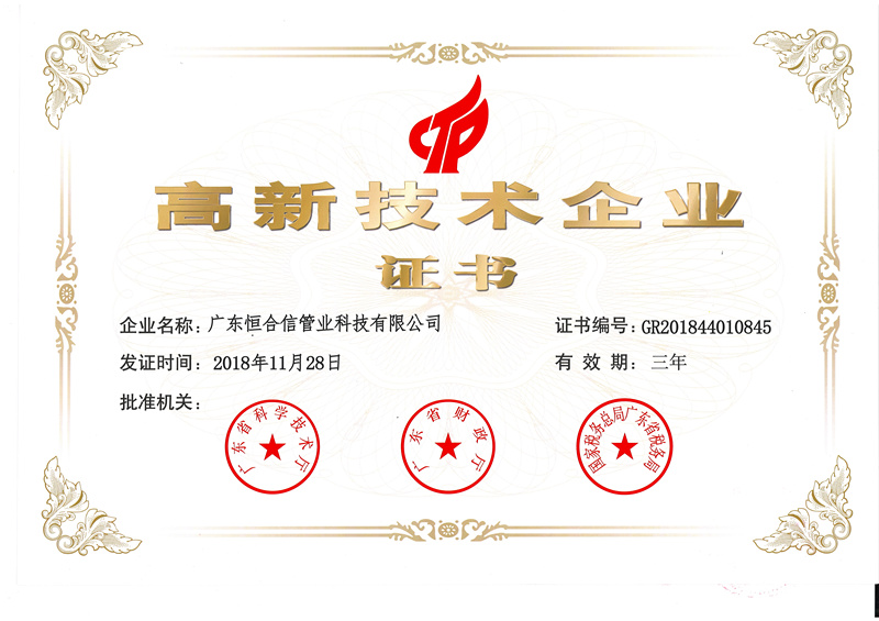 近日,恒合信管業(yè)喜迎佳音!經(jīng)有關(guān)部門組織專家評(píng)審、公示等程序后,恒合信管業(yè)順利通過(guò)高新技術(shù)認(rèn)定,獲得國(guó)家高新技術(shù)企業(yè)證書(shū)。