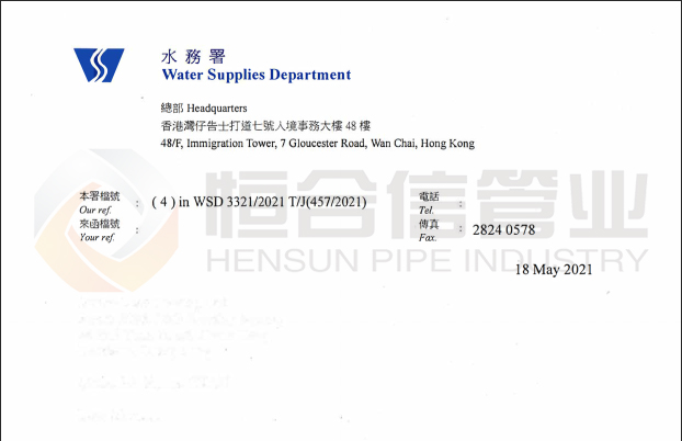 【“恒”喜訊】熱烈慶祝恒合信管業(yè)通過香港水務(wù)署“HENSUN” 不銹鋼管準(zhǔn)入許可近日,恒合信管業(yè)喜迎佳音!恒合信管業(yè)順利通過香港水務(wù)署授予的“HENSUN”不銹鋼管準(zhǔn)入許可。