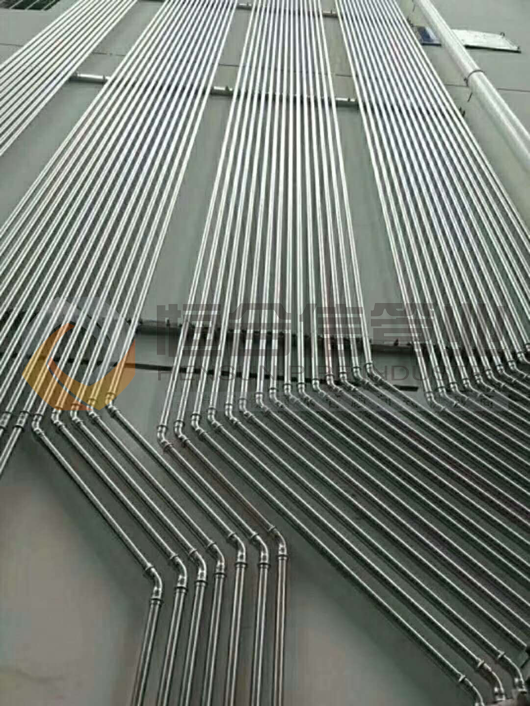 4)管道應合理配置伸縮補償裝置與支架(固定支架和活動支架),以控制管道的伸縮方向或補償。明敷或非埋設隱敷的熱水薄壁不銹鋼管的直線段長度超過10~15m時,宜采取管道軸向的補償措施。當公稱直徑大于50mm時,宜設置不銹鋼波形膨脹節(jié)或不銹鋼線性溫度補償器。